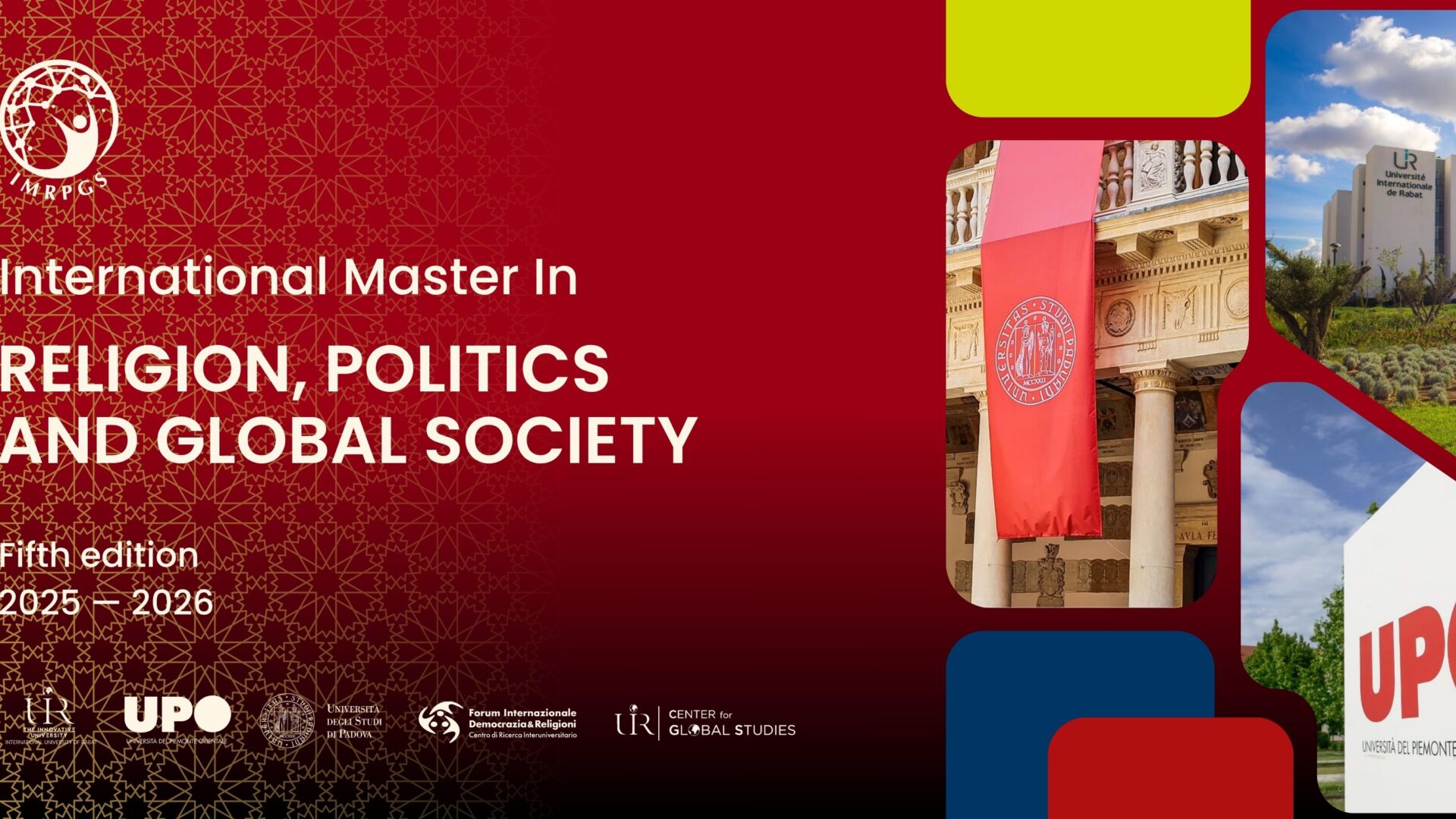 In order to strengthen the scientific partnership between the University of Padua, the University of Eastern Piedmont and the International University of Rabat, and to promote academic training and scientific cooperation between the countries of Europe and the Islamic world within the framework of the activities of the international scientific network PriMEDNetwork (https://www.primednetwork.eu/), the fifth Edition of the International Master in Religion, Politics and Global Society – IMRPGS has recently been launched for the academic year 2025-2026.تعزيزا للشراكة العلمية بين جامعة بادوفا وجامعة بييمونتي أورينتالي والجامعة الرباط الدولية وعملا على الارتقاء بالتكوين الأكاديمي والتعاون العلمي بين الدول الأوروبية والعالم الاسلامي في إطار أنشطة الشبكة العلمية الدولية بريماد، تم إطلاق النسخة الخامسة من برنامج الماستر الدولي في الدين والسياسة والمجتمع العالمي للسنة الجامعية 2025 – 2026 .Afin de renforcer le partenariat scientifique entre l’Université de Padoue, l’Université du Piémont Oriental et l’Université Internationale de Rabat, et de promouvoir la formation académique et la coopération scientifique entre les pays d’Europe et du monde islamique dans le cadre des activités du réseau scientifique international PriMEDNetwork (https://www.primednetwork.eu), la cinquième Edition de l’International Master in Religion, Politics and Global Society – IMRPGS vient d’être lancée pour l’année académique 2025-2026.Schedule of lessons First period Second period Third period Fourth period Fifth period Sixth periodVIDEOS PRESENTATION The idea of the “International Master in Religion, Politics and Global Society- IMRPGS” was born within the framework of a consolidated scientific cooperation, thanks to the PriMED network (composed of 22 universities: 12 Italian and 10 belonging to the OIC-Organization of Islamic Cooperation https://primed-miur.it), founded within the framework of the action of the “Prevention and Interaction Project in the Trans- Mediterranean- Space” PriMED, which was financed through the Call for Applications of the Italian Ministry of University and Research – MUR-OCI-2018 “Creation of networks of Italian universities in the implementation of cooperation agreements between Italian universities and those of OIC-Organization of Islamic Cooperation States” (Executive Decree No. 3089 of 16/11/2018 – ID 82382). The intense framework of the scientific activities of the PriMED Project, but also the various actions addressed to the public sectors and civil society (the professional training of various professional categories, including those of a religious nature, its training activities aimed at a wider public concerning the phenomenon of violent radicalisation and strategies to combat it), have promoted the development of this international study path, involving three units ofthe PriMED network, with the collaboration of professors from other units in other countries. The project also enhances the experience of three rounds (2017-2020) of the “Master in Religions, Politics and Citizenship”, implemented by the University of Eastern Piedmont and the University of Padua, with the collaboration of the Instituto de Investigaciones y Estudios Superiores de Granada. The new didactic proposal, the IMRPGS, in fact, is conceived as the continuation of this last Master, but brought to a higher degree of internationalization with the entry of the International University of Rabat.BOARD OF DIRECTORSProf. Stefano AllieviDirector of the IMRPGS Master, University of Padua, ItalyProf. Farid al AsriCo-Executive Director of Maser IMRPGS and Director of the Center for Global Studies (CGS), International University of Rabat, MoroccoProf. Roberto MazzolaMember of the Board of Directors of the FIDR Interuniversity Centre, University of Piedmont Oriental, ItalyProf. Mohammed Khalid Brandalise RhazzaliCo-Executive Director of Maser IMRPGS, Deputy Director of the FIDR Interuniversity Centre, University of Padua, ItalyCOORDINATION COMMITTEEMounya Allali, University of Piedmont Oriental, ItalyMohammed Addi, Adam’s Centre for Research and Studies, SwitzerlandValentina Schiavinato, University of Padua, ItalyJhan Loudiyi, International University of Rabat, MoroccoFACULTY Hassan Alamri, University of Piedmont Oriental, Italy Ridwan As-Sayyid, Mohammed Bin Zayed University, Abu Dhabi, Émirats Arabes Unis. Stefano Allievi, University of Padua, Italy Hamid Boudar, University Mohammed V Rabat, Maroc Adone Brandalise, University of Padua, Italy Paolo Branca, Catholic University of Milan, Italy Antonio Cuciniello, Catholic University of Milan, Italy Farid El Asri, International University of Rabat, Morocco Djilali Elmestari, Center for Anthropological, Social and Cultural Research, Algeria Mariachiara Giorda, University Rome III, Italy Abdellatif Kidai, Mohammed V University Rabat, Morocco Khalid Mayar Elidrissi, Moroccan Center for International and Prospective Studies, Morocco Roberto Mazzola, University of Piedmont Oriental, Italy Beatriz Mesa, International University of Rabat, Morocco Paolo Naso, Sapienza University of Rome, Italy Enzo Pace, University of Padua, Italy Hassan Rachik, Hassan II University of Casablanca, Morocco Mohammed Kerrou, El-Manar University, Tunisia Mohammed Khalid Brandalise Rhazzali, University of Padua, Italy Vincenzo Romania, University of Padua, Italy Giuseppina Scala, University of Padua, ItalyINTERNATIONAL GUEST PROFESSORS Rkia Achmal, University Mohammed V Rabat, Morocco Abderrahim El Atri, University Mohammed V Rabat, Morocco Zakaria Boudhim, Mohammed V University Rabat, Morocco Patrice Brodeur, Institute of Religious Studies, University of Montreal, Canada Ahmed Bo