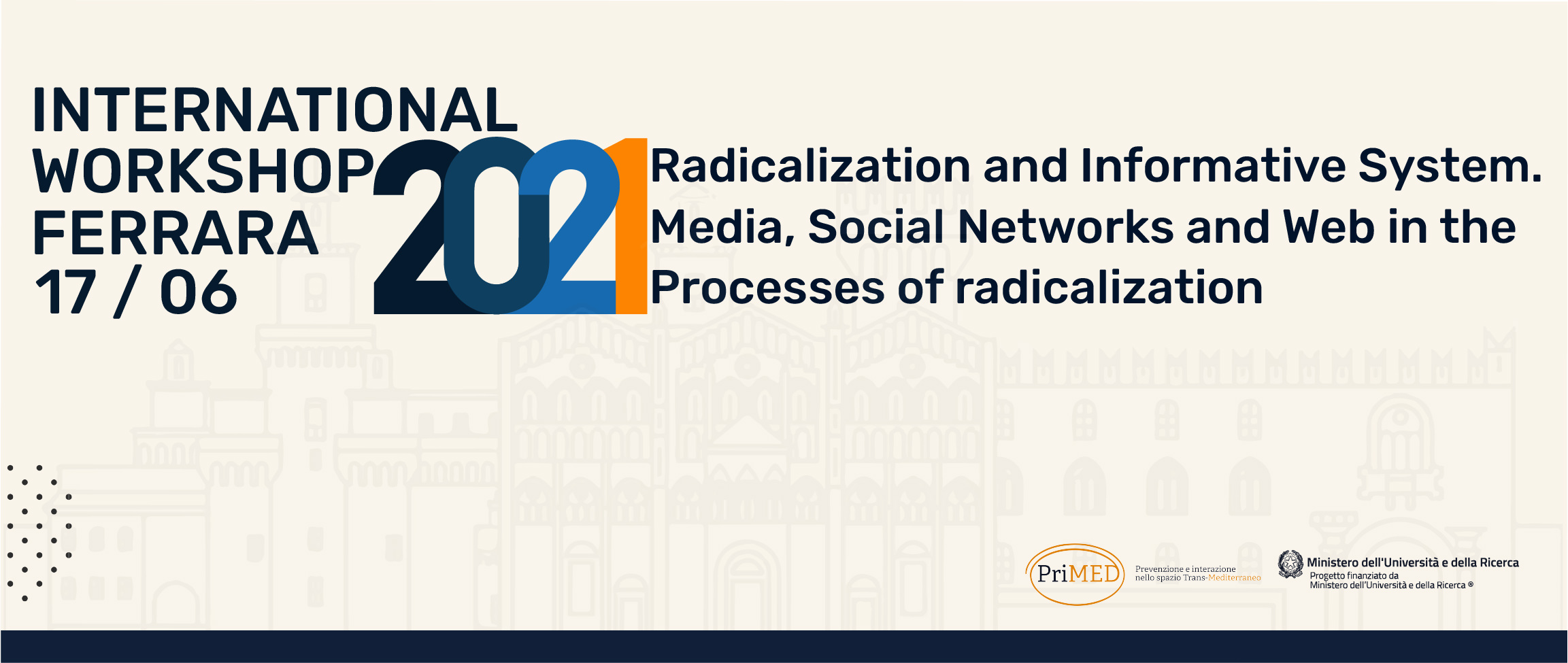 After the opening event on 27 February 2019, and the First Workshop on 6 June 2019: “Judges in comparison, laws and jurisprudential guidelines on the fight against radicalization and de-radicalization phenomena of an Islamist matrix in the trans-Mediterranean area”, the second appointment of the University of Ferrara for the International Project “PriMED – Prevention and Interaction in the Trans-Mediterranean Space” will be held remotely on 17 June 2021.